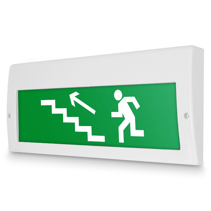 Световое табло «Направление к эвакуационному выходу по лестнице вверх (левосторонний)». Плоское световое табло Молния (220В РИП) с резервным источником питания служит для обозначения эвакуационных путей в помещениях различного назначения. Конструкция светового указателя дает возможность менять надпись. Световой блок светового указателя выполнен на светодиодах и не требует текущего обслуживания