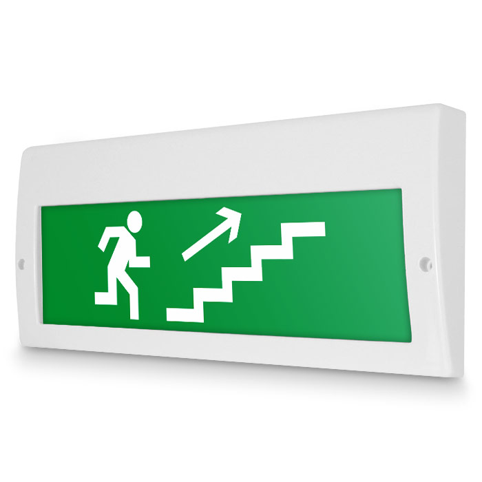 Световое табло «Направление к эвакуационному выходу по лестнице вверх (правосторонний)». Плоское световое табло Молния (220В РИП) с резервным источником питания служит для обозначения эвакуационных путей в помещениях различного назначения. Конструкция светового указателя дает возможность менять надпись. Световой блок светового указателя выполнен на светодиодах и не требует текущего обслуживания