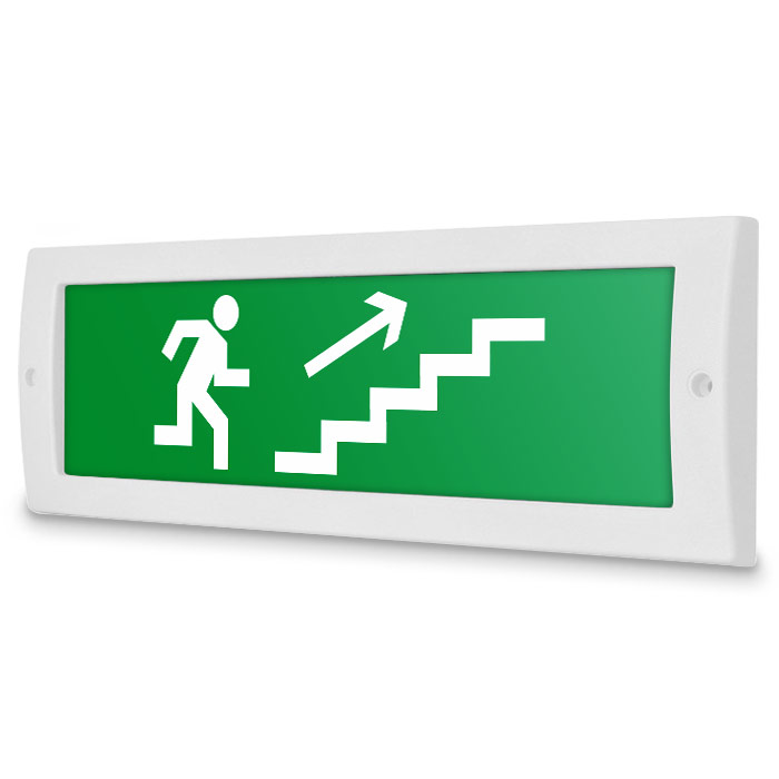 Световое табло «Направление к эвакуационному выходу по лестнице вверх (правосторонний)». Плоское световое табло Молния (12В) служит для обозначения эвакуационных путей в помещениях различного назначения. Данный светоуказатель имеет минимальное энергопотребление. Световой блок светового указателя выполнен на светодиодах и не требует текущего обслуживания