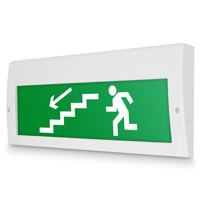 Световое табло «Направление к эвакуационному выходу по лестнице вниз (левосторонний)». Плоское световое табло Молния (220В РИП) с резервным источником питания служит для обозначения эвакуационных путей в помещениях различного назначения. Конструкция светового указателя дает возможность менять надпись. Световой блок светового указателя выполнен на светодиодах и не требует текущего обслуживания