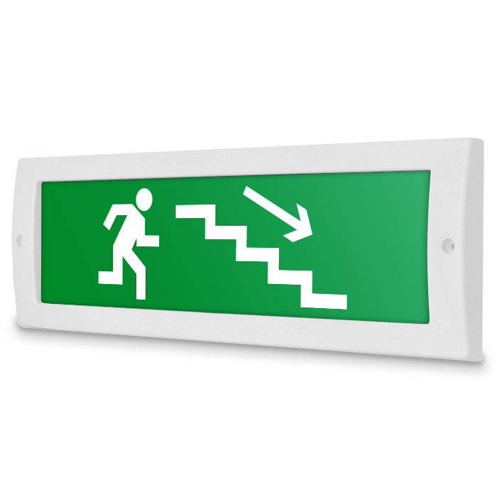Световое табло «Направление к эвакуационному выходу по лестнице вниз (правосторонний)». Плоское световое табло Молния (12В) служит для обозначения эвакуационных путей в помещениях различного назначения. Данный светоуказатель имеет минимальное энергопотребление. Световой блок светового указателя выполнен на светодиодах и не требует текущего обслуживания