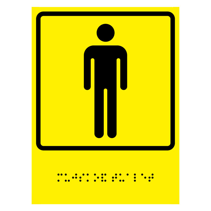 Тактильная пиктограмма «Мужской туалет» с азбукой Брайля, ДС68 на 2-мм пластике, имеет размер 200х300 мм (при желании можно выбрать другой вариант, размер и цвет). Изготавливается с рельефом (для тактильного восприятия инвалидами по зрению).