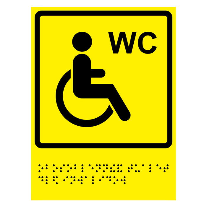 Тактильная пиктограмма «Туалет для инвалидов» с азбукой Брайля, ДС64 на 2-мм пластике, имеет размер 150х225 мм (при желании можно выбрать другой вариант, размер и цвет). Изготавливается с рельефом (для тактильного восприятия инвалидами по зрению).
