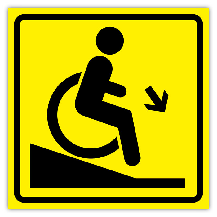 Визуальный предупреждающий знак «Осторожно! Крутой спуск», ДС79 на 3-мм полистироле, имеет размер 150х150 мм (при желании можно выбрать другой вариант, размер и цвет). Изготавливается без рельефа (не подходит для тактильного восприятия инвалидами по зрению).