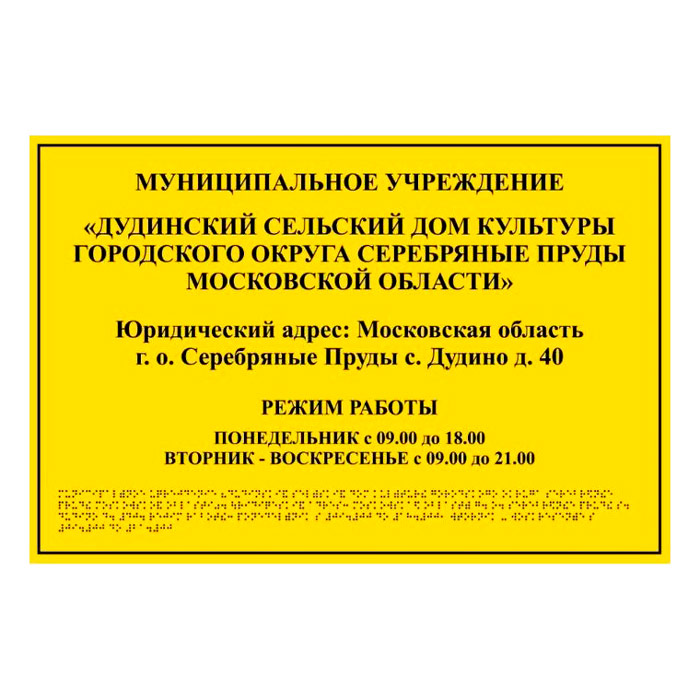 Тактильная вывеска с дублированием азбукой Брайля, ДС11 на 3-мм полистироле, имеет размер 600х400 мм (при желании можно выбрать другой вариант, размер и цвет). Изготавливается с рельефом (для тактильного восприятия инвалидами по зрению).