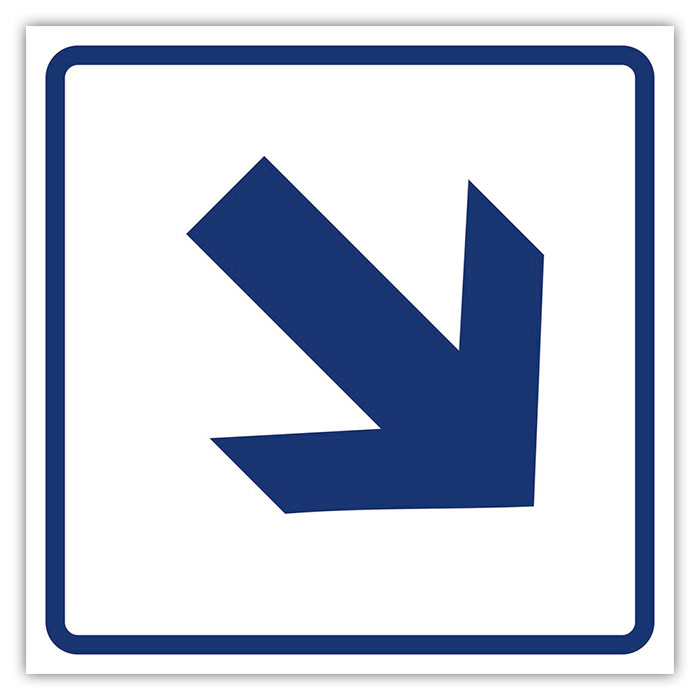 Визуальная пиктограмма «Направление движения, диагональная стрелка», ДС83 на 2-мм пластике, имеет размер 200х200 мм (при желании можно выбрать другой вариант, размер и цвет). Изготавливается без рельефа (не подходит для тактильного восприятия инвалидами по зрению).