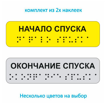 Тактильные наклейки на ручки и поручни с обозначением начала и окончания спуска, с дублированием азбукой Брайля. Устанавливается непосредственно в начале самого поручня на боковой стороне на расстоянии 5 см от края. В комплекте 2 наклейки: тактильная наклейка «Начало спуска» и наклейка «Окончание спуска» со шрифтом Брайля.