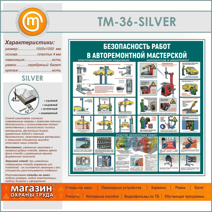 Стенд «Безопасность работ в авторемонтной мастерской» (TM-36-SILVER)