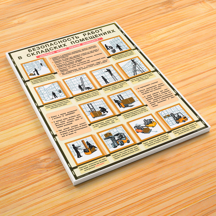 Плакат «Безопасность работ в складских помещениях» содержит общие правила безопасности при работе в складских помещениях и правила пожарной безопасности