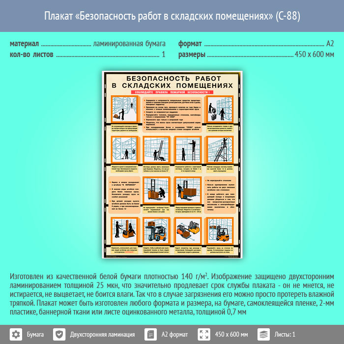 Плакат «Безопасность работ в складских помещениях» (С-88, ламинированная бумага, А2, 1 лист)