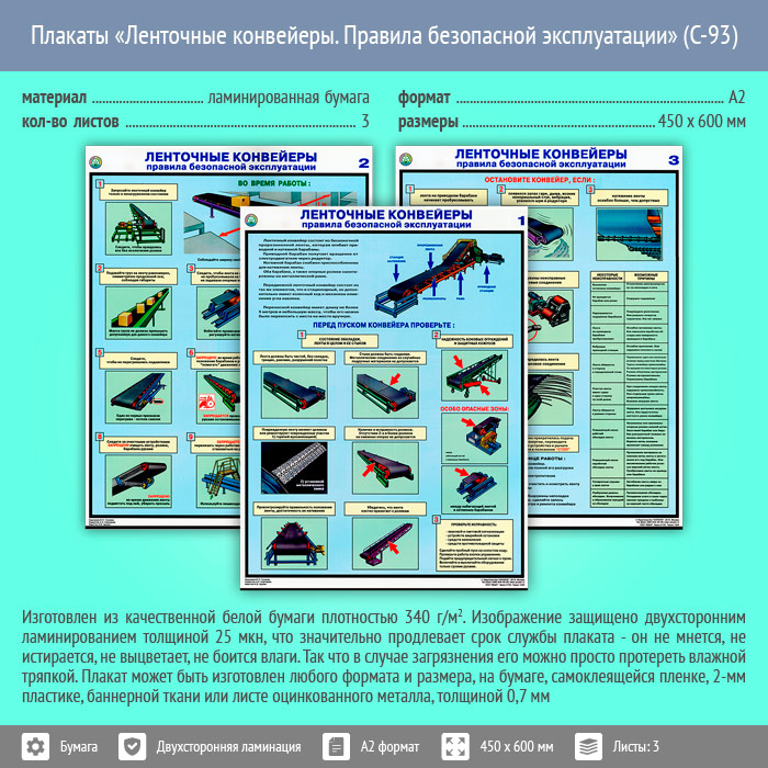 Плакаты «Ленточные конвейеры. Правила безопасной эксплуатации» (С-93, ламинированная бумага, А2, 3 листа)