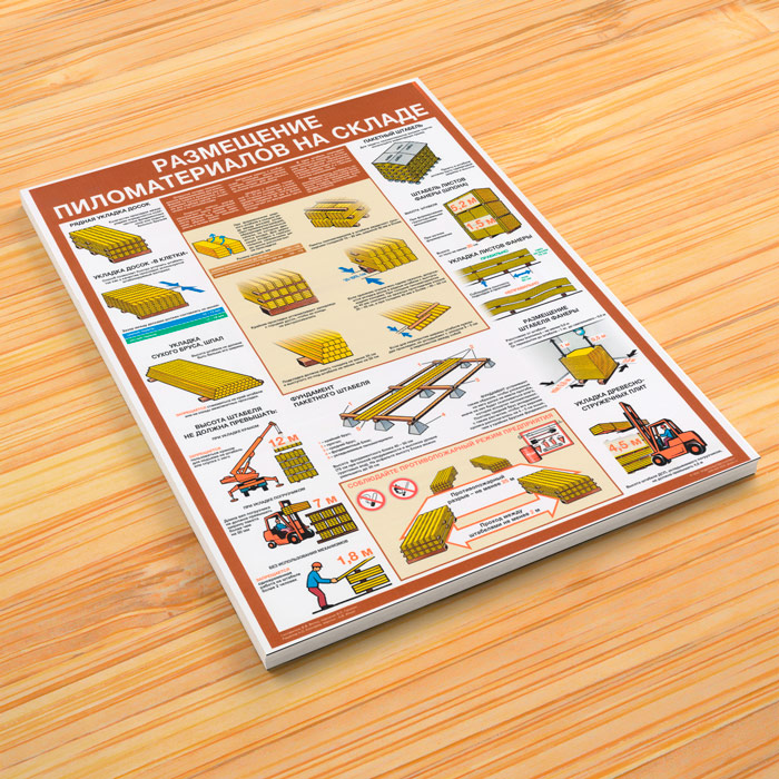 Плакат «Размещение пиломатериалов на складе» наглядно расскажет о правилах и порядке складирования древесной продукции