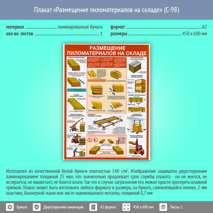 Плакат «Размещение пиломатериалов на складе» (С-98, ламинированная бумага, А2, 1 лист)