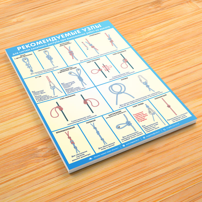Плакат «Рекомендуемые узлы для систем канатного доступа при выполнении работ на высоте» предназначен для обучения и аттестации высотников всех категорий. В плакате представлены виды узлов для выполнения операций по креплению грузов, эвакуации персонала с рабочего места при аварийной ситуации, самостягивающихся узлов. Изображены узлы для организации самоспасания при зависании, для прикрепления к анкерным точкам и других назначений. Плакат соответствует установленным правилам и инструкциям по охране труда