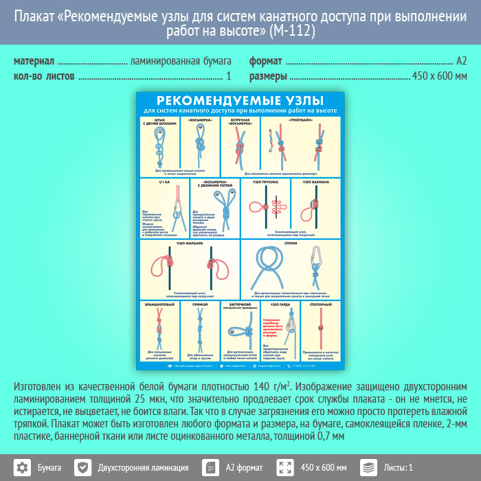 Плакат «Рекомендуемые узлы для систем канатного доступа при выполнении работ на высоте» (М-112, ламинированная бумага, А2, 1 лист)