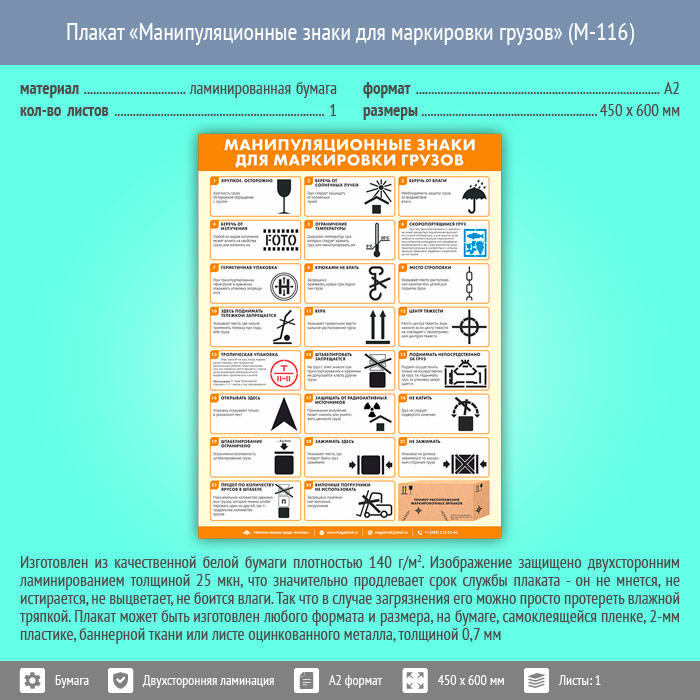 Плакат «Манипуляционные знаки для маркировки грузов» (М-116, ламинированная бумага, А2, 1 лист)