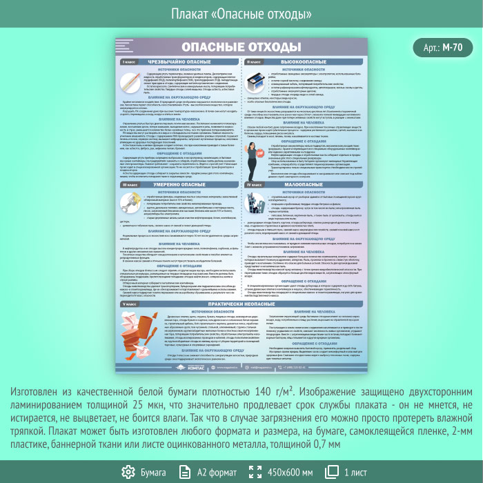 Плакат «Опасные отходы» (М-70) содержит классификацию отходов по степени воздействия на окружающую среду и человека. Рассказывает об источниках, содержащих опасные отходы и обращении с ними