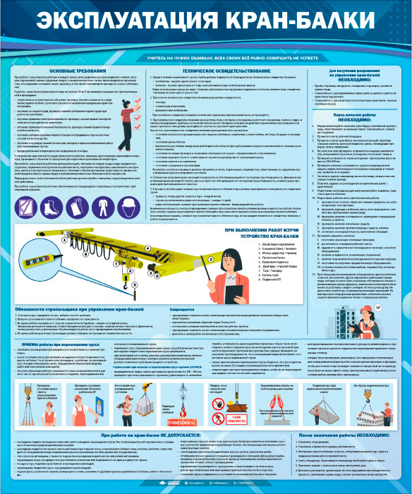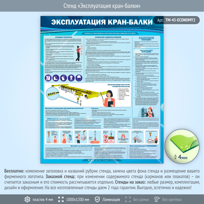 Стенд «Эксплуатация кран-балки» (TM-45) содержит информацию об основных требованиях эксплуатации кран-балки, о ее техническом освидетельствовании, об устройстве кран-балки, о том, что необходимо для получения разрешения на управление кран-балкой, о действиях перед началом работы, об обязанностях стропальщика, о приемах работы при перемещении груза, о том, что не допускается при работе на кран-балке и о том, что необходимо сделать после окончания такой работы.