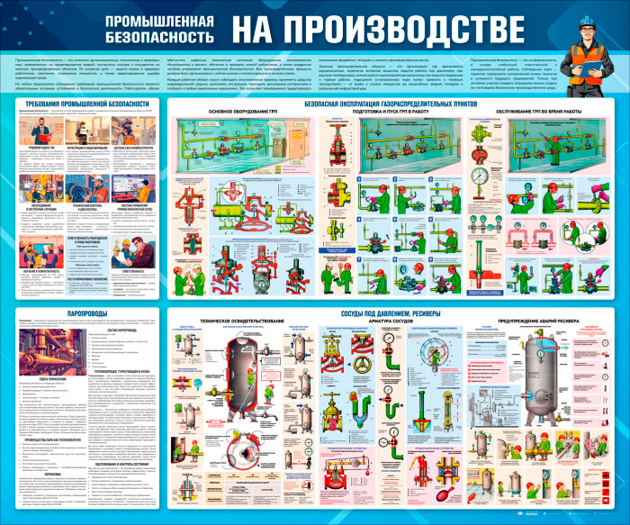 Стенд «Промышленная безопасность на производстве» (TM-46)посвящён вопросам обеспечения промышленной безопасности при работе с опасным оборудованием и системами на производственных объектах. На плакатах представлены требования промышленной безопасности, устройство и обслуживание сосудов под давлением и газораспределительных пунктов, правила эксплуатации паропроводов, методы технического освидетельствования и предупреждения аварий. Особое внимание уделено визуальным схемам и пошаговым инструкциям по безопасной эксплуатации оборудования. Стенд помогает формировать культуру безопасности на предприятии, снижать производственные риски и предупреждать аварийные ситуации.