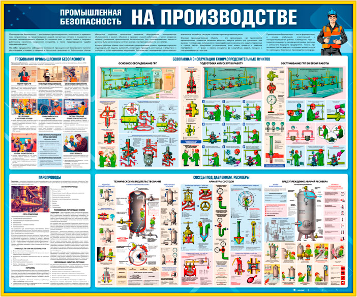 Стенд «Промышленная безопасность на производстве» (TM-46)посвящён вопросам обеспечения промышленной безопасности при работе с опасным оборудованием и системами на производственных объектах. На плакатах представлены требования промышленной безопасности, устройство и обслуживание сосудов под давлением и газораспределительных пунктов, правила эксплуатации паропроводов, методы технического освидетельствования и предупреждения аварий. Особое внимание уделено визуальным схемам и пошаговым инструкциям по безопасной эксплуатации оборудования. Стенд помогает формировать культуру безопасности на предприятии, снижать производственные риски и предупреждать аварийные ситуации.