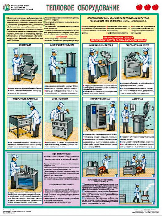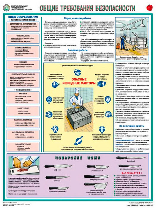 - Плакат «Общие требования безопасности» – перечислены основные виды оборудования, рассказано о технике безопасности перед началом работы и во время работы, опасные производственные факторы, а также техника безопасности при работе с поварскими ножами