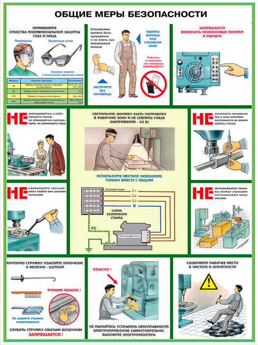 - Плакат «Общие меры безопасности» – средства защиты и правила безопасности, освещение и оборудование рабочего места