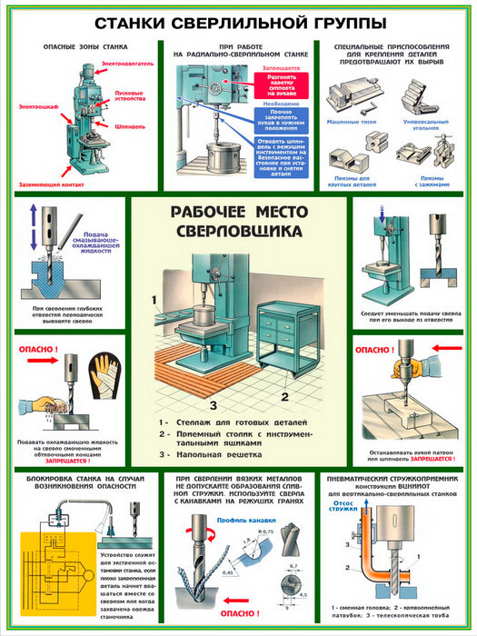 - Плакат «Станки сверлильной группы» – рабочее место сверловщика и техника безопасности при выполнении работ