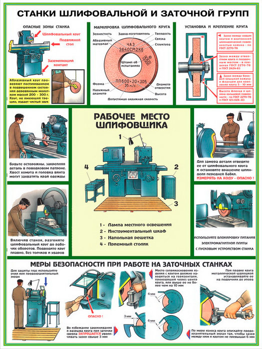 - Плакат «Станки шлифовальной и заточной групп» – рабочее место шлифовщика, меры безопасности при работе на заточных станках