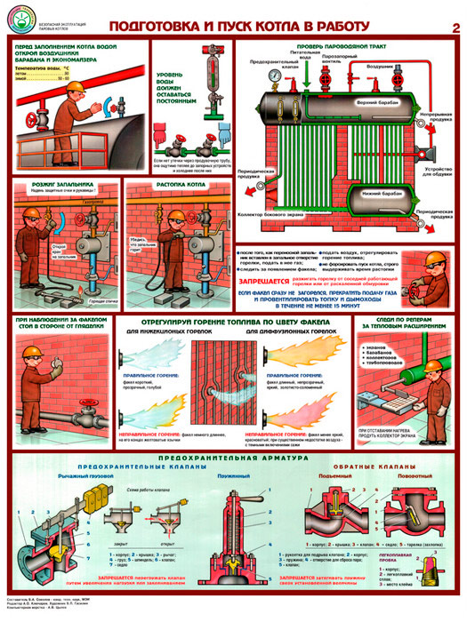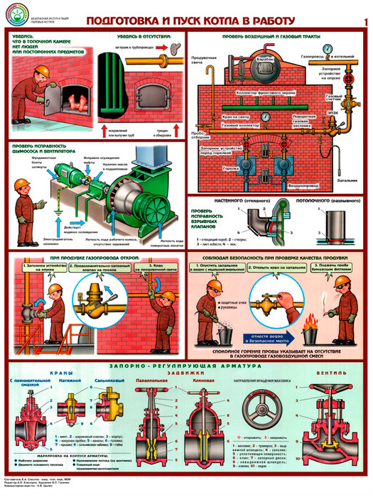 - Два плаката «Подготовка и пуск котла в работу» – проверка исправности, продувка, проверка тракта, розжиг запальника, растопка котла, регулировка горения, запорно-регулирующая и предохранительная аппаратура