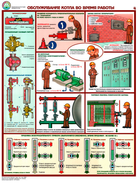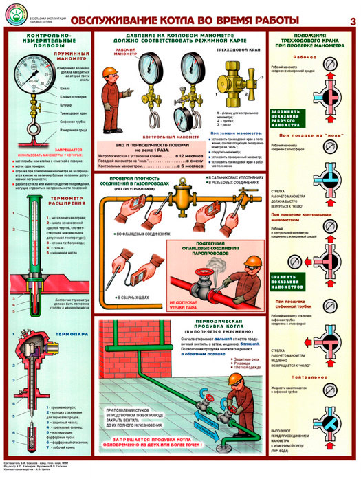 - Два плаката «Обслуживание котла во время работы» – контрольно-измерительные приборы, положения трехходового крана при проверке манометра, проверка исправности и продувка котла