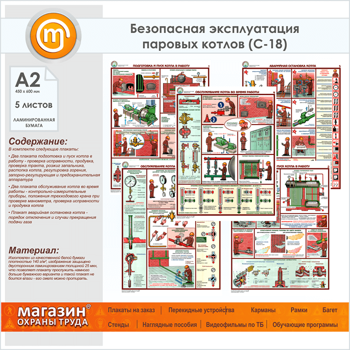 Плакаты «Безопасная эксплуатация паровых котлов» (С-18, ламинированная бумага, А2, 5 листов)