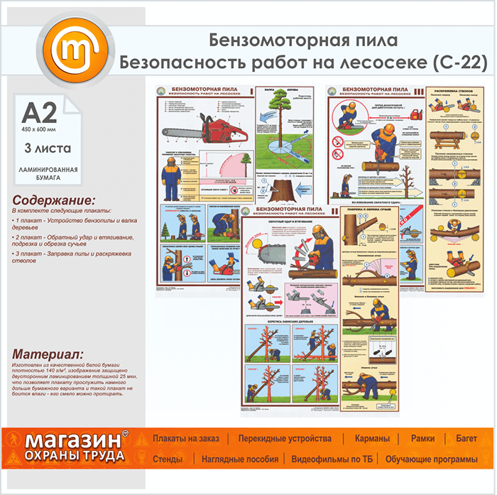 Плакаты «Бензомоторная пила. Безопасность работ на лесосеке» (С-22, ламинированная бумага, А2, 3 листа)