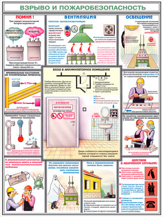 - Плакат «Взрыво- и пожаробезопасность» – вентиляция и освещение, вход в аккумуляторное помещение, действия в аварийной ситуации