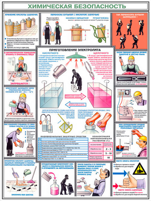 - Плакат «Химическая безопасность» – приготовление электролита, хранение кислоты, техника безопасности при работе с щелочью и кислотой