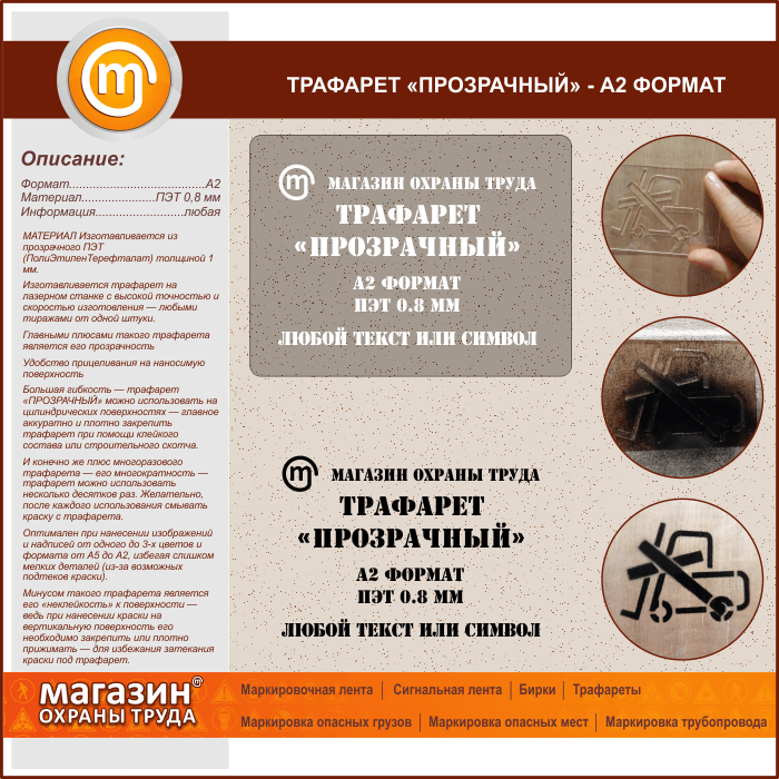 Виниловые трафареты А2, А3, А4 и А5 форматов изготавливаются из ПЭТ (ПолиЭтиленТерефталата), толщиной 0,8 мм. Изображение вырезается на лазерном станке с высокой точностью и скоростью изготовления. Возможен любой тираж от одной штуки
