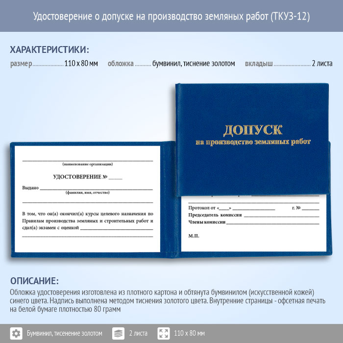Бланк удостоверения о допуске на производство земляных работ оформляется жестким переплетом из бумвинила. Надпись на переплете декорируется тиснением. Материал обложки имитирует кожу и украшает документ. Благодаря отличным потребительским качествам покрытия удостоверение защищено от влаги, устойчиво к многочисленным перегибам и истиранию