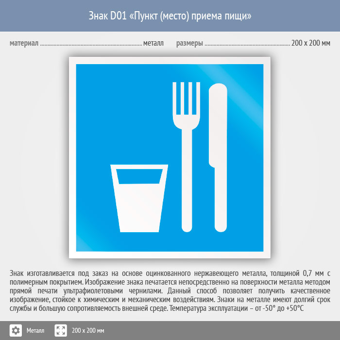 Знак D01 «Пункт (место) приема пищи» (металл, 200х200 мм)