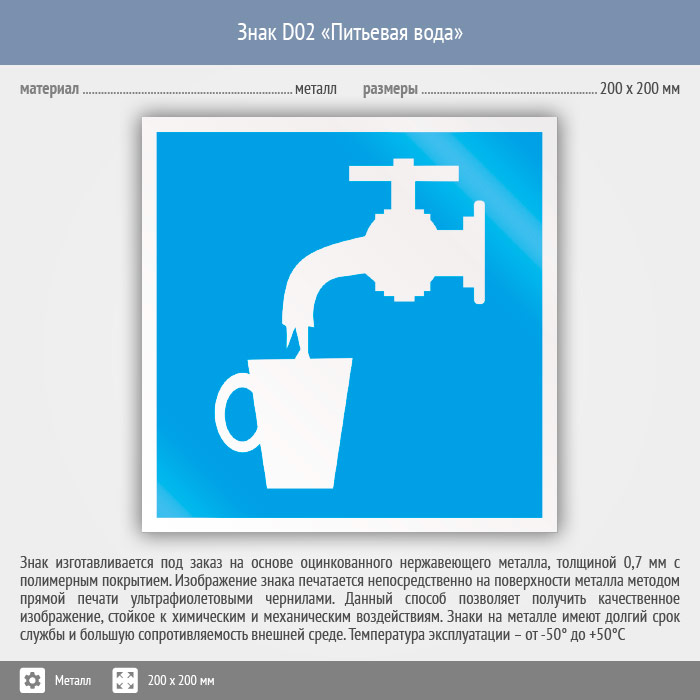 Знак D02 «Питьевая вода» (металл, 200х200 мм)
