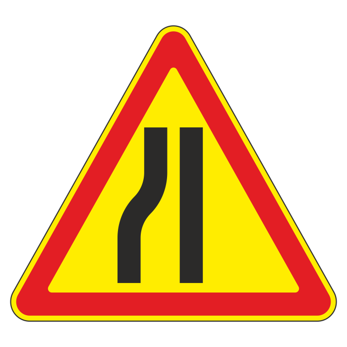 Сужение дороги с левой стороны. Вне населенных пунктов знак устанавливают также перед мостовыми сооружениями и тоннелями, если ширина проезжей части в пределах искусственного сооружения равна или меньше, чем на подходах к нему, а в населенных пунктах - меньше, чем на подходах к нему