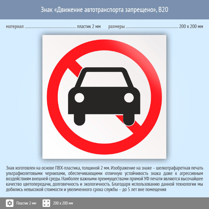 Знак «Движение автотранспорта запрещено», B20 на пластике, размером 200х200 мм служит для обозначения мест, где движение на транспортных средствах запрещено. Вспомогательные знаки и таблички полностью соответствуют современным требованиям и стандартам. Таблички с поясняющими надписями используются в качестве самостоятельного знака, либо в качестве дополнения к основному знаку безопасности