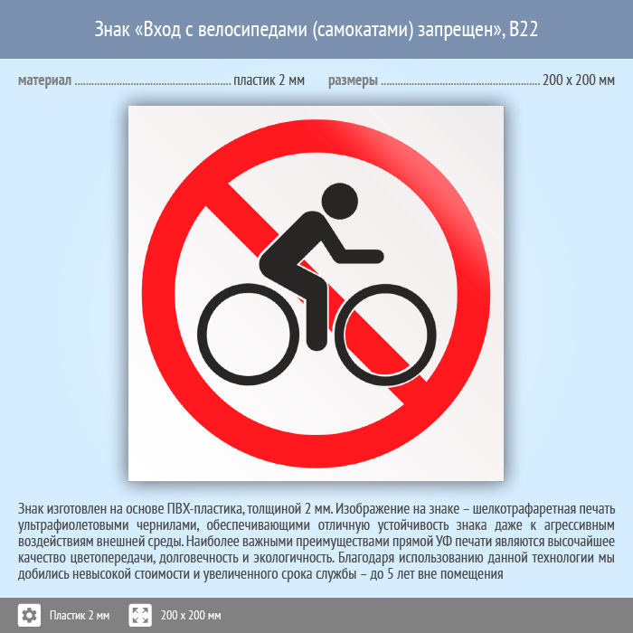 Знак «Вход с велосипедами (самокатами) запрещен», B22 на пластике, размером 200х200 мм служит для обозначения мест, где вход с велосипедами или самокатами запрещен. Вспомогательные знаки и таблички полностью соответствуют современным требованиям и стандартам. Таблички с поясняющими надписями используются в качестве самостоятельного знака, либо в качестве дополнения к основному знаку безопасности
