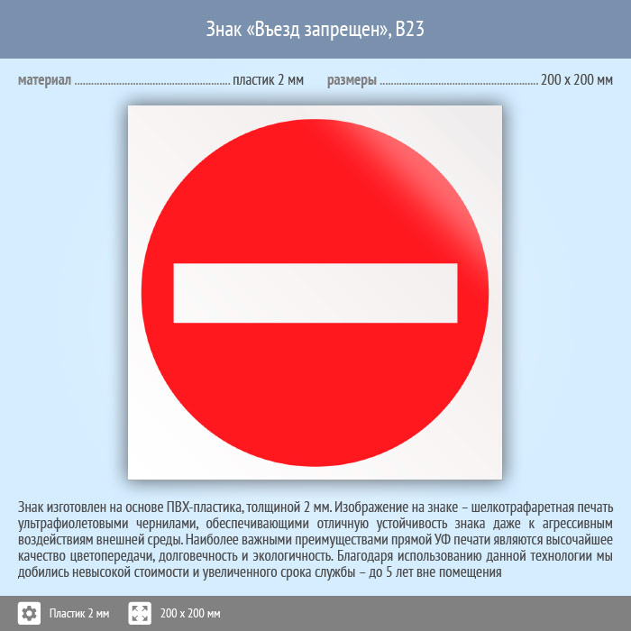 Знак «Въезд запрещен», B23 на пластике, размером 200х200 мм обозначает, что в данном месте въезд транспортных средств запрещен. Вспомогательные знаки и таблички полностью соответствуют современным требованиям и стандартам. Таблички с поясняющими надписями используются в качестве самостоятельного знака, либо в качестве дополнения к основному знаку безопасности