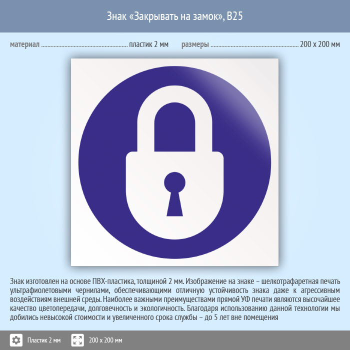 Знак «Закрывать на замок», B25 на пластике, размером 200х200 мм напоминает о необходимости закрывать дверь на замок. Вспомогательные знаки и таблички полностью соответствуют современным требованиям и стандартам. Таблички с поясняющими надписями используются в качестве самостоятельного знака, либо в качестве дополнения к основному знаку безопасности