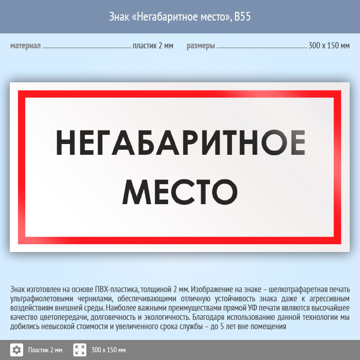 Знак «Негабаритное место», B55 на пластике, размером 300х150 мм указывает, что данный предмет больше обычных размеров. Вспомогательные знаки и таблички полностью соответствуют современным требованиям и стандартам. Таблички с поясняющими надписями используются в качестве самостоятельного знака, либо в качестве дополнения к основному знаку безопасности
