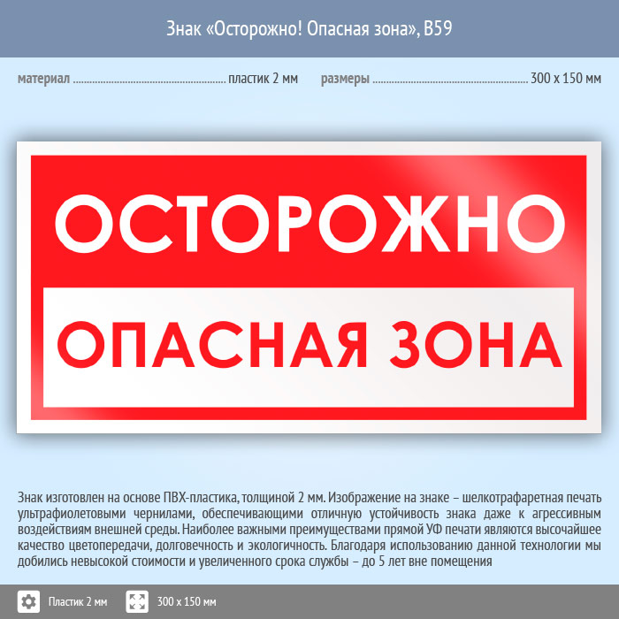 Знак «Осторожно! Опасная зона», B59 на пластике, размером 300х150 мм призывает к осторожности, предупреждая о близости расположения опасного места. Вспомогательные знаки и таблички полностью соответствуют современным требованиям и стандартам. Таблички с поясняющими надписями используются в качестве самостоятельного знака, либо в качестве дополнения к основному знаку безопасности