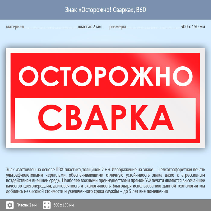 Знак «Осторожно! Сварка», B60 на пластике, размером 300х150 мм призывает к осторожности, предупреждая о сварочных работах. Вспомогательные знаки и таблички полностью соответствуют современным требованиям и стандартам. Таблички с поясняющими надписями используются в качестве самостоятельного знака, либо в качестве дополнения к основному знаку безопасности