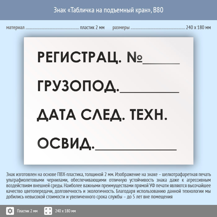 Знак «Табличка на подъемный кран», B80 на пластике, размером 240х180 мм вывешивается на подъемных кранах с целью извещения о работе крана. Вспомогательные знаки и таблички полностью соответствуют современным требованиям и стандартам. Таблички с поясняющими надписями используются в качестве самостоятельного знака, либо в качестве дополнения к основному знаку безопасности
