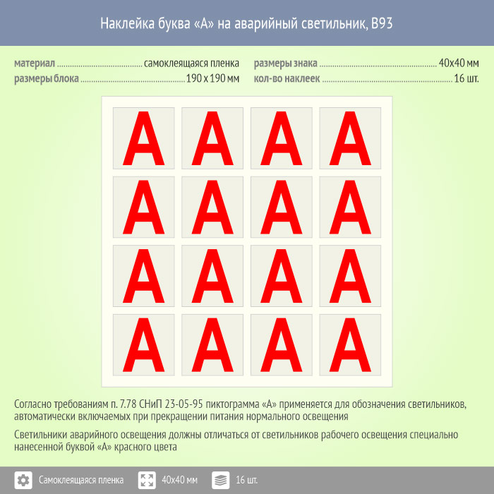 Самоклеящаяся буква «А» на аварийный светильник, B93 размером 40х40 мм поставляется блоком из 16 наклеек. Изготавливается на прозрачной самоклеящейся пленке с печатью экосольвентными чернилами, после чего каждая пиктограмма вырезается по контуру. Вид и размеры знака пиктограммы на аварийный светильник полностью соответствуют требованиям нормативных документов