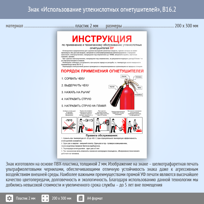 Знак «Использование углекислотных огнетушителей», B16.2 на пластике, размером 200х300 мм располагается возле углекислотного огнетушителя и является инструкцией к его использованию. Вспомогательные знаки и таблички полностью соответствуют современным требованиям и стандартам. Таблички с поясняющими надписями используются в качестве самостоятельного знака, либо в качестве дополнения к основному знаку безопасности