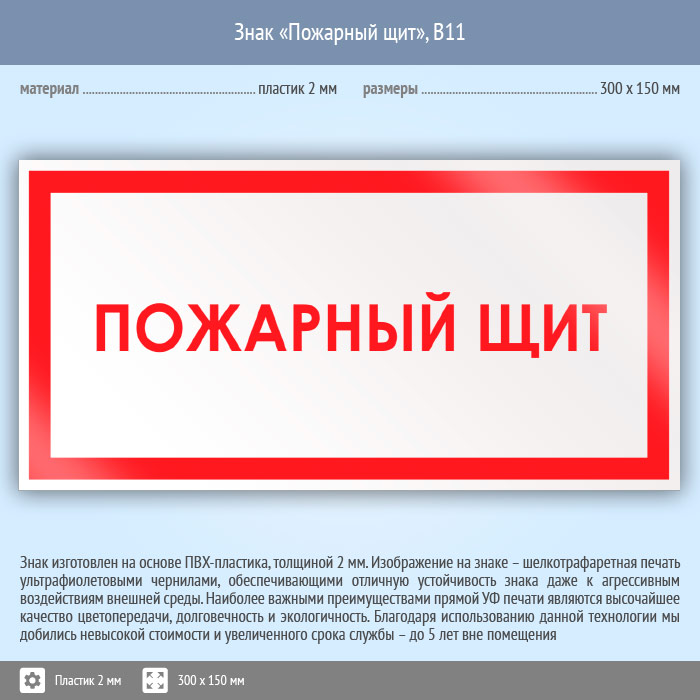 Знак «Пожарный щит», B11 на пластике, размером 300х150 мм служит для обозначения расположения пожарного щита. Вспомогательные знаки и таблички полностью соответствуют современным требованиям и стандартам. Таблички с поясняющими надписями используются в качестве самостоятельного знака, либо в качестве дополнения к основному знаку безопасности